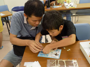 8月3日(日)ゆいの杜小学校放課後子ども教室で4回目となる出前授業を実施しました。受講生は小学3年生29名で、同数の親御さんが参加され全体で58名と大人数になったため、講義と工作は2つの教室を利用して進めました。アンケート結果をみると、とても理解度が高いことと、記述欄をみても的確な回答や意見が多く見られました。日曜日であったこともありお父さんの参加が多く、親子で熱心に授業に取り組む姿が見られ、良い機会を提供できたと思います。(写真は親子で工作に夢中になる姿)
