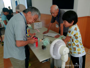 8月20日(水)宇都宮市環境学習センターで環境未来館子どもエコクラブの出前授業を実施しました。子どもエコクラブは、宇都宮市環境学習センターが主催する親子参加型の体験教室で、毎月、自然系を中心に活動を展開しています。今回は紙芝居+再エネ実験体験+かざぐるま工作を行ないました。参加受講生は、幼稚園~中学生まで14名それに親御さん10名で、とても楽しい時間を過ごしました。クイズにも実験体験にもみなさん積極的に参加してくれました。今回は、作りあげた「かざぐるま」を使って、誰の「かざぐるま」が一番よくまわるかのコンテストを行いました。記録証に各自の回転数を記録しました。(写真参照)回転数コンテストの結果は、605、721~893、895回転/分と個人差がおおきかったです。